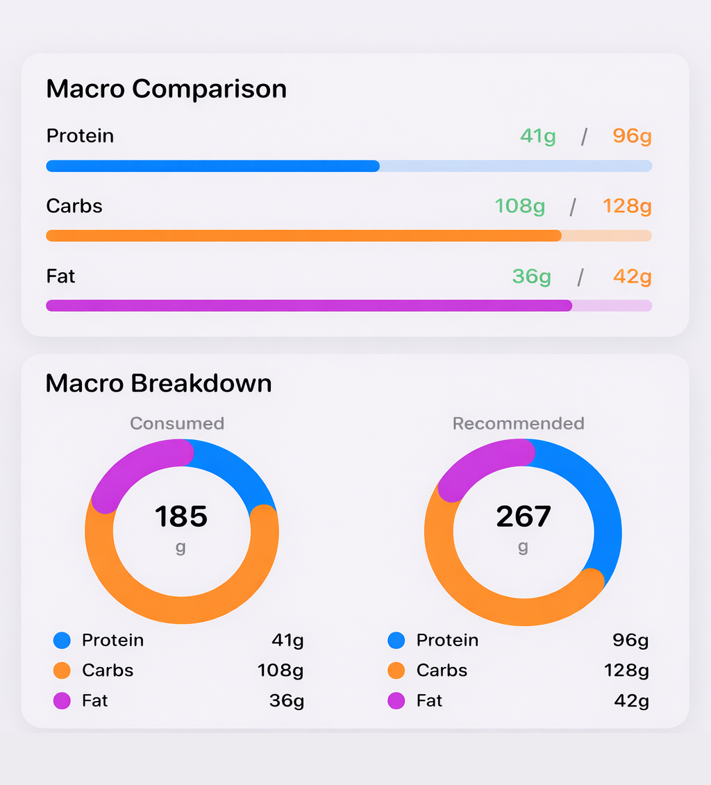 Track your daily nutrition with precision. See your calorie intake, macros, and progress at a glance. AI-powered analysis helps you stay on target throughout the day.